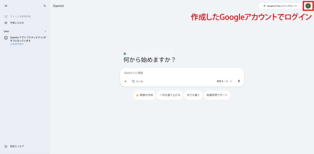 次にGeminiを開き、作成したGoogleアカウントでログインします。