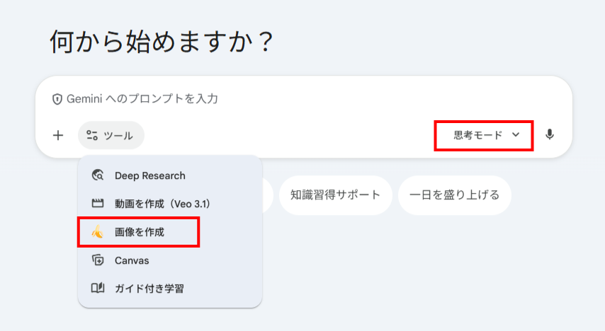 ツールから「画像を作成」、モードから「思考モード」を選択してください。
